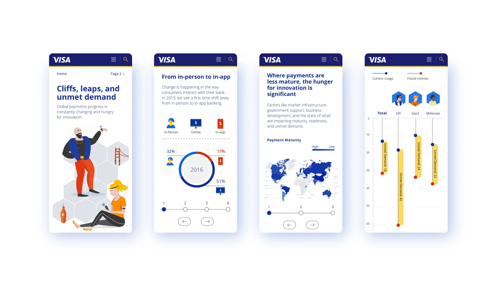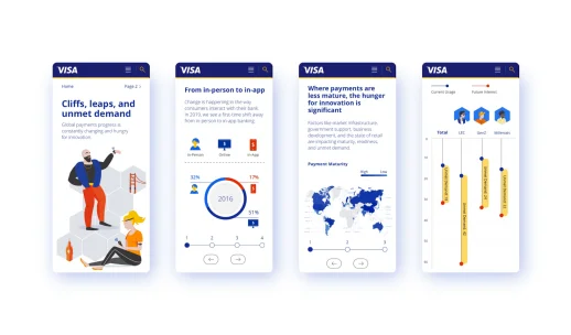 Money makes the world go round. But how is the world making money get around? That’s the question Visa set out to answer in their ambitious international study of payment method usage. Through this annual report, Visa is able to identify trends by country so they can put investment into payment methods with the greatest potential. (Wearables, AR, IoT, etc.) Our job, here at Born & Bred, was to digest this vast, exhaustive information and translate it into data-visualization that felt friendly, intuitive, and—most importantly—Visa. We attentively crafted a color-coding system to keep the visuals simple to navigate. And since it’s an international study, we developed an illustration style with landmarks and people of all cultures. It’s a human touch that keeps the content engaging, personal, and impactful.